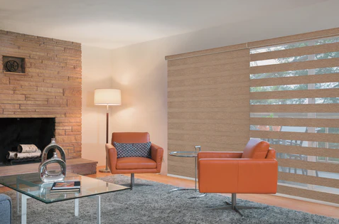 Zebra blinds, also known as transitional shades, are a type of horizontal blind that consists of alternating sheer and solid fabric panels. You can easily adjust the solid and sheer panels to create varying levels of light control and privacy. For example, if you want to let more light into a room while still maintaining some privacy, you can adjust the panels so that the sheer fabric is in the center.